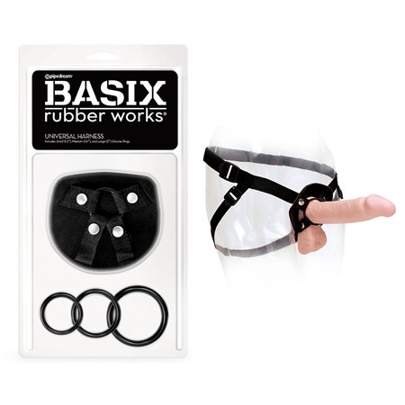 The BASIX Universal Harness is available in Regular and Plus-Size and includes 3 silicone rings. Easy to adjust and fun to use for sexy strap-on play. Most of our BASIX dildos are Strap-On ready and Harness Compatible. Includes small (1.2") Medium (1.6") and Large (2") Silicone rings.