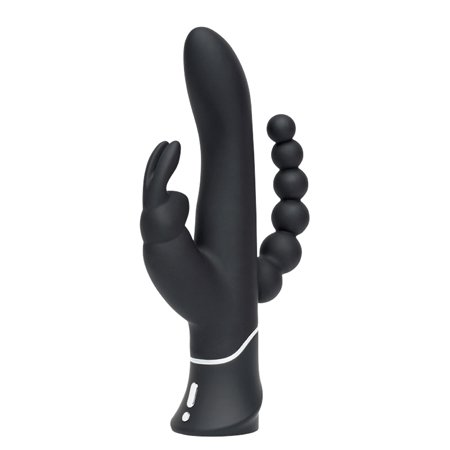 Happy Rabbit Triple Curve Rechargeable Rabbit style vibrator in Black. Peak pleasure with 3 deliriously powerful motors 9 intense functions in the ears and beads and 12 powerful speeds and patterns in the shaft. Crafted from velvety soft silicone this USB rechargeable rabbit vibrator has been designed to target all of the hot spots. Not only a bedroom buddy the rabbit's waterproof silicone body means it is shower friendly and open to a dip in the tub at any time.