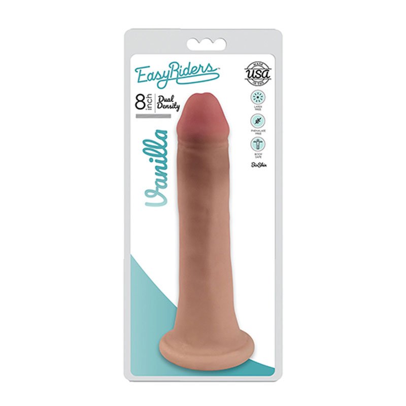 Feels better than the real thing. Easy Rider Dual Density Bioskin Dong. Firm inner core with super soft outer skin. Harness compatible suction cup grips any flat surface. Made in the USA of lifelike Bioskin. Material Thermoplastic Elastomers TPE . Handmade and hand finished with incredible detail. Color Vanilla Measures 8 inches length. 7.5 inches insertion length. 2 inches width.Take your pleasure out for a spin tonight with Easy Riders BioSkin Dual Density Dong with Suction Base by Curve Novelties. Designed for playful beginners and intermediate users this big sexy toy features firm yet flexible BioSkin material that feels so real PLUS lifelike details to fill your favorite hole. A fat phallic tip parts you easily and a thick detailed shaft with veins fills you up. Suck or ride on this kinky treat and enjoy for sexual pleasure like never before! A sturdy suction cup base prevents Easy Riders Dual Density Dong from traveling too far during vaginal or anal lovemaking and slips into your harness of choice for couple-friendly sessions that takes your breath away. And the suction cup base sticks to most flat hard surfaces for creative hands-free straddling when you`re on your own or if you want to put on a show! Easy Riders BioSkin Cock is made from latex-free phthalate-free body-safe dual density TPE for your peace of mind. Lubricate well with your favorite water-based lube and clean up in a snap before and after use with antibacterial soap and a warm water rinse (air-dry completely prior to storage). Curve Novelties sextoy novelty measures 8 satisfying inches long (20 cm) 7.5 Inch insertable 2 thick inches in diameter (5 cm) and is made in the USA