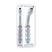 Discover the pure joy of a sleek glass massager. Nonporous and extremely hygienic the surface of this iridescent blue-green-violet beauty is deliciously slippery and smooth especially with your favorite lubricant. Try the gently curved end with its generous bulbous head or enjoy the triple-beaded end with its targeted tapered tip. A ring between the two shafts keeps your grip grounded so you can focus on the ultimate pleasure that only glass can deliver! Dip into warm or cool water before you play for erotic temperature sensation. Dual-ended glass massager