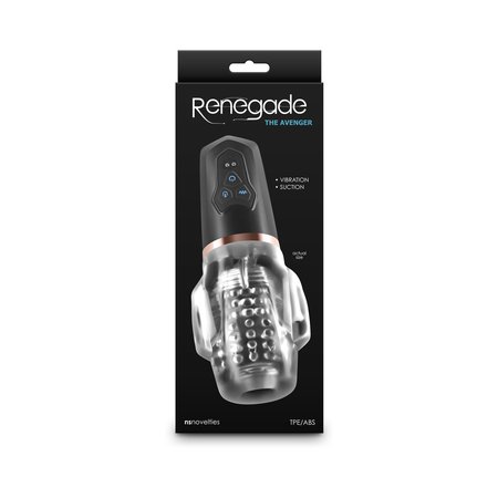 Experience unparalleled simulated oral pleasure and satisfaction with the Renegade Avenger a cutting-edge male electronic masturbator. The Avenger boasts six suction and seven vibration settings for exquisite stimulation and sensations. Rechargeable. Water Resistant. Suitable for use with all lubricants included silicone. Crafted with the highest quality body-safe materials.